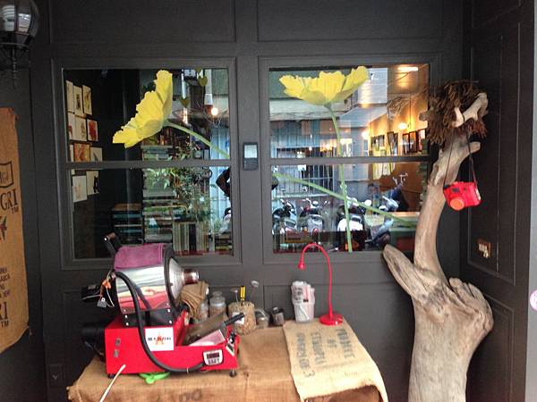 店門口的烘豆Sample說明了這是一家自家烘焙店。