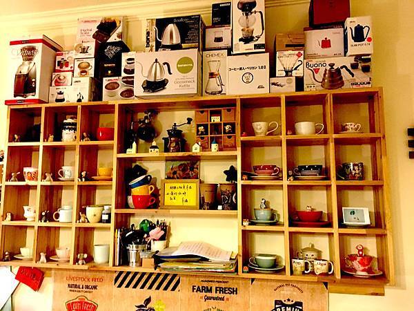 牆面上有整個架子是各式咖啡器具