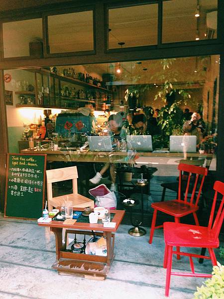 門口吸菸區的紅色椅子很吸睛
